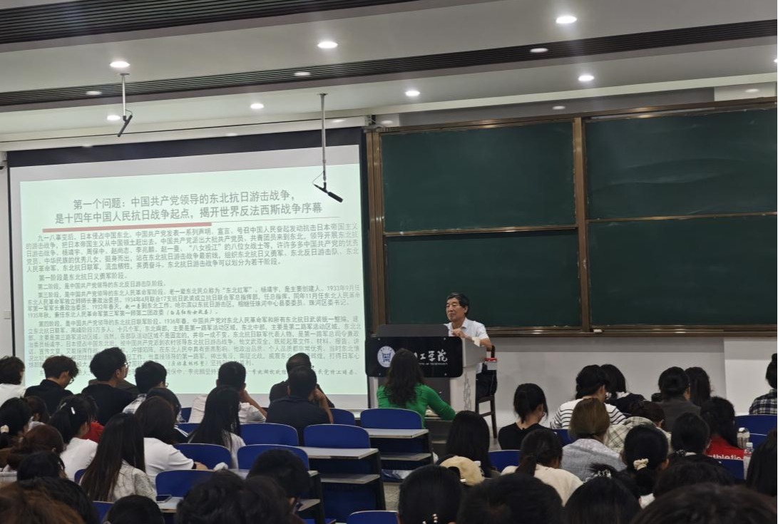薛庆超教授从“抗日游击战争揭开世界反法西斯战争序幕”“七七事变开辟世界反法西斯战争的东方主战场”“中国人民抗日战争和世界反法西斯战争的最后胜利”等三个方面,通过详实的史料,回顾十四年抗战的艰苦历程,讲述杨靖宇、赵尚志、赵一曼等英烈事迹,阐释伟大抗战精神深刻内涵,激励大家赓续红色血脉,弘扬抗战精神,筑牢理想信念之基,激发爱国热情与报国之志。